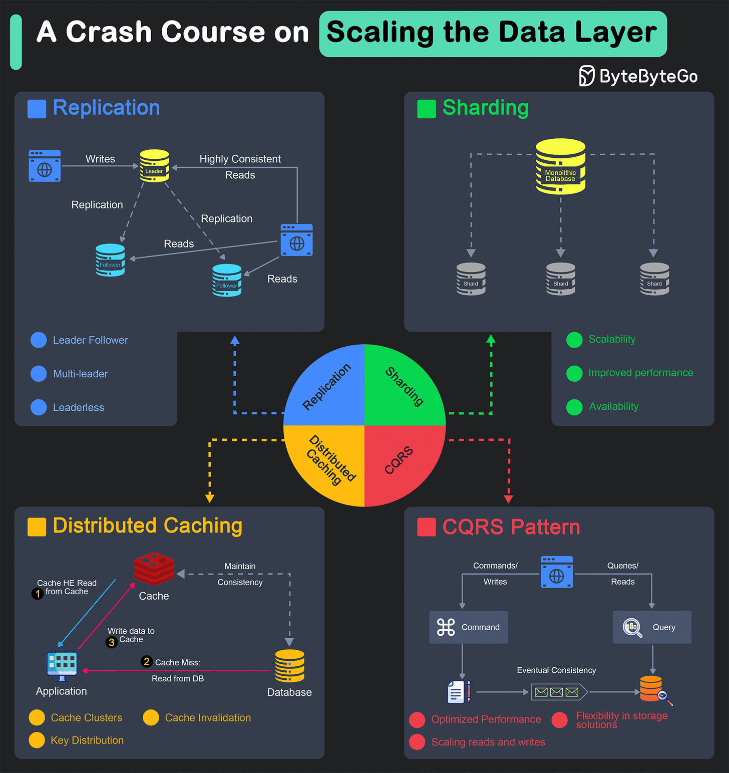 Horizontally scaling the data layer is one of the most important pieces to scale the application as a whole. There are various techniques to achieve this. However, each has pros and cons.