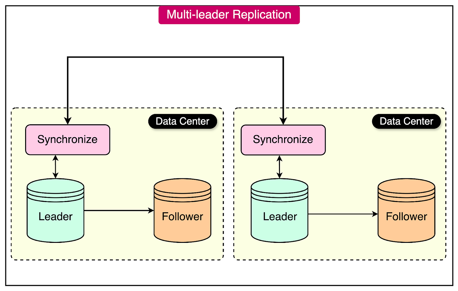 See the diagram below for an example of multi-leader replication where leader nodes are located in different data centers.