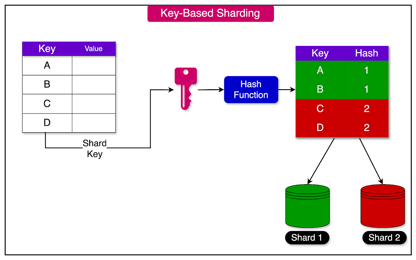 Key-based sharding, also known as hash-based sharding, assigns a particular key to a shard using a hash function.