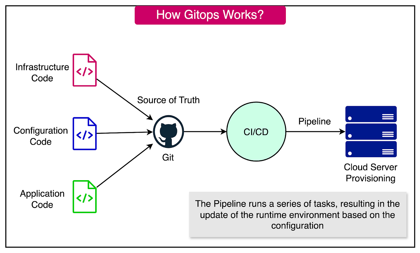 GitOps leverages a Git workflow combined with continuous integration and continuous delivery (CI/CD) to automate infrastructure updates. This approach treats a Git repository as the single source of truth for all code and the starting point for deployments.