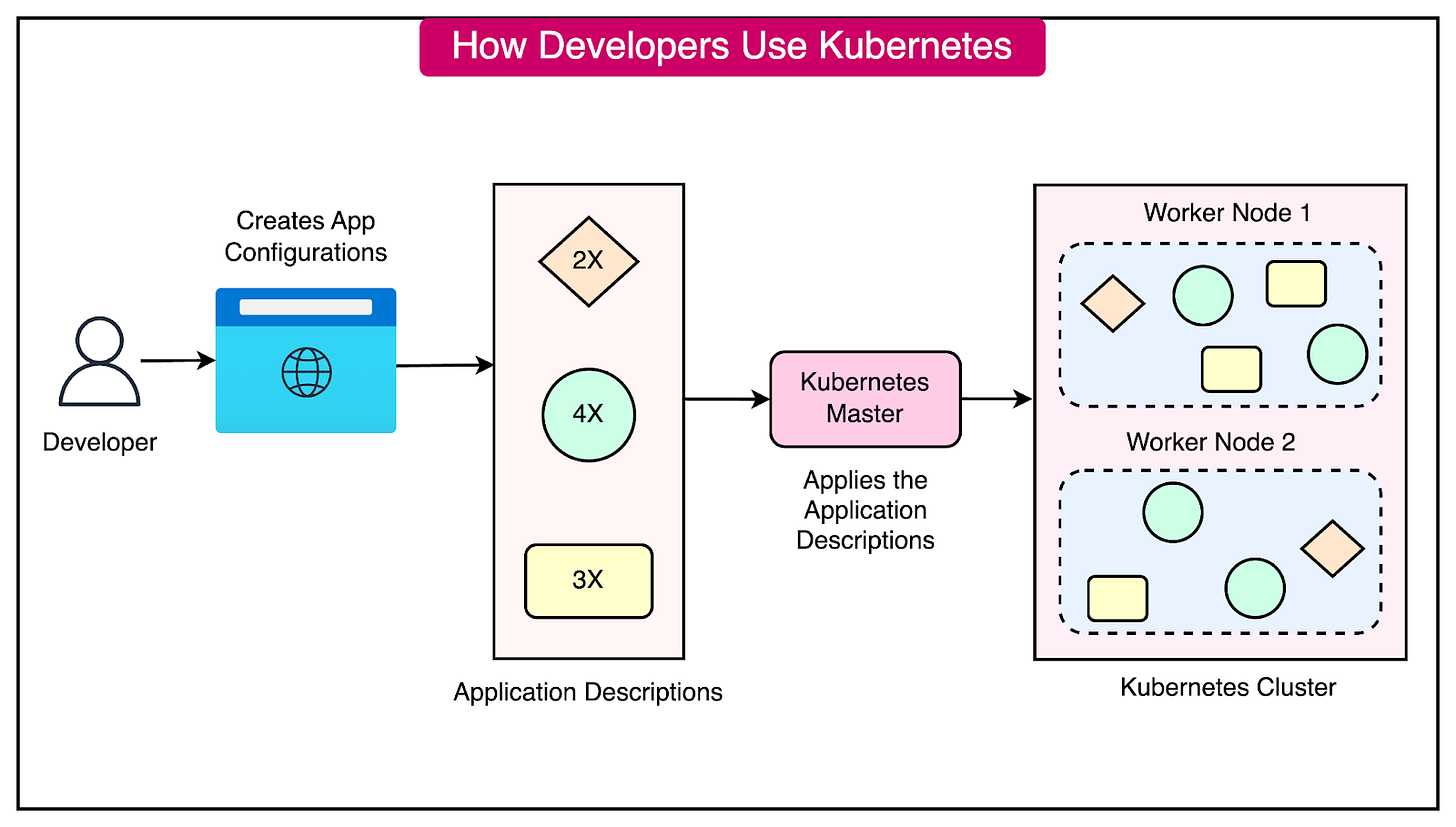 The diagram below shows how developers interact with Kubernetes and what happens behind the scenes.