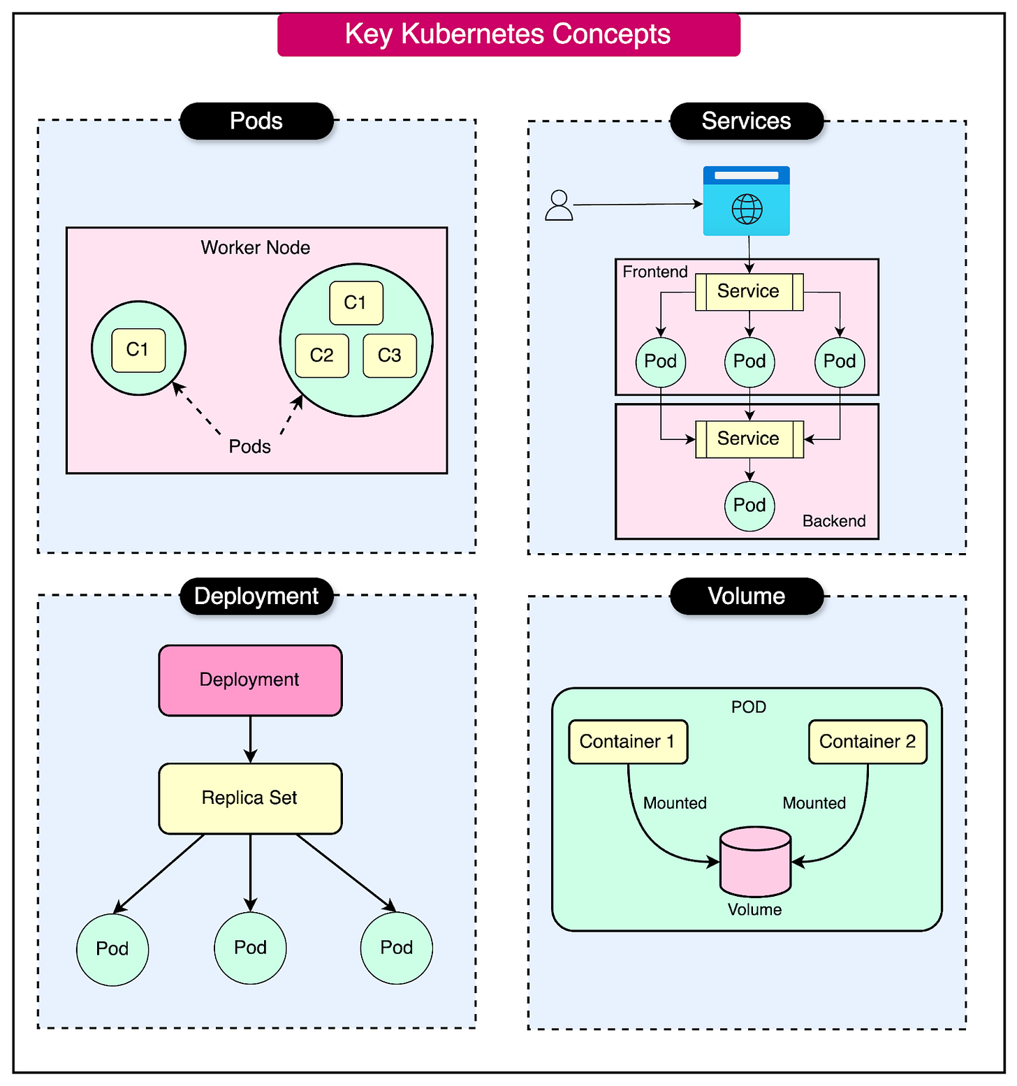 Here’s a quick look at some of the concepts and resources that Kubernetes provides: