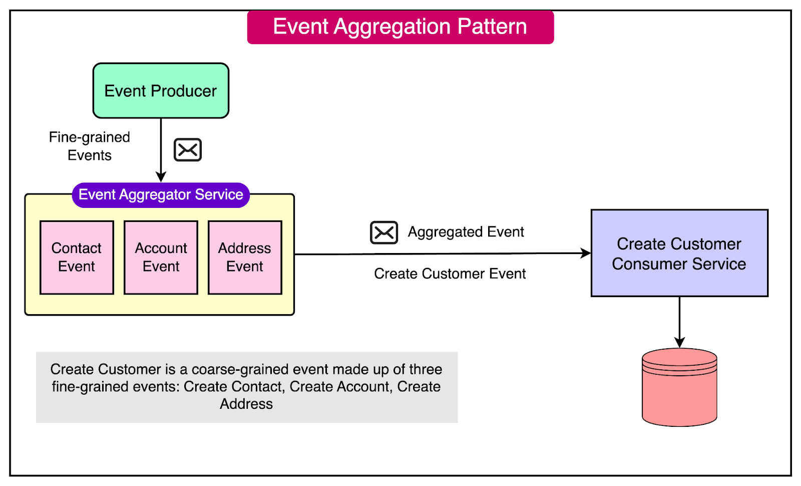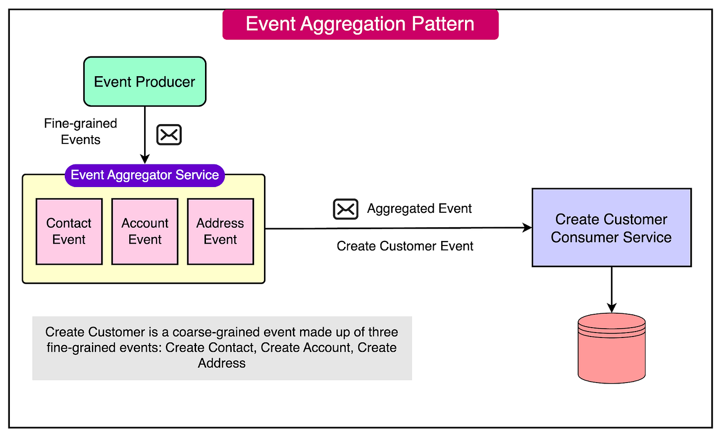 The event aggregator service consolidates the fine-grained Contact, Account, and Address events into a single coarse-grained “Create Customer” event. The event aggregator maintains the relationships between the entities (Contact, Account, Address) and the overall “Customer”.