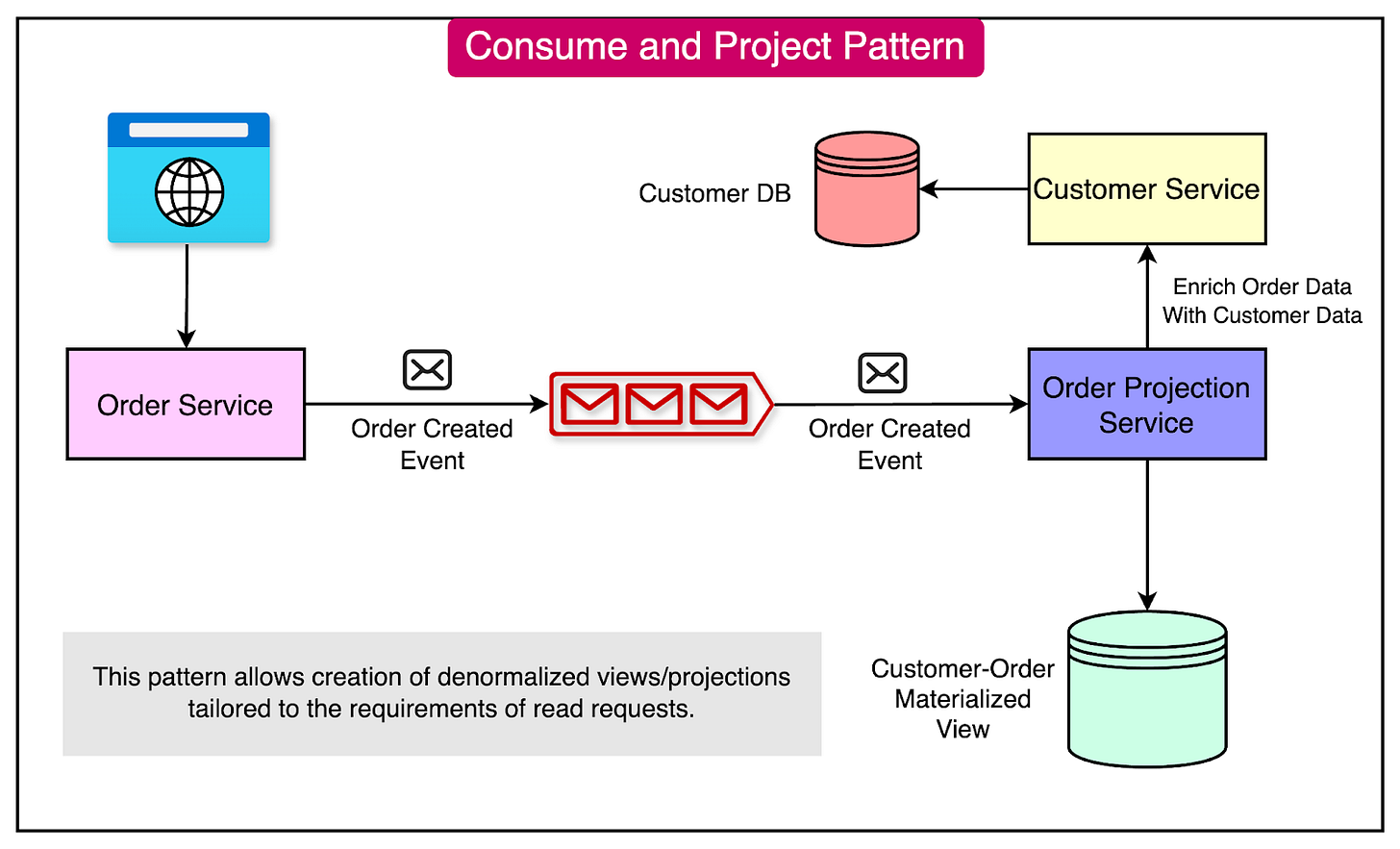 See the diagram below that shows this pattern where customer and order data is projected into a materialized view for read requests. The Order Projection Service receives the Order data via events and then enriches it by fetching customer data from Customer service.