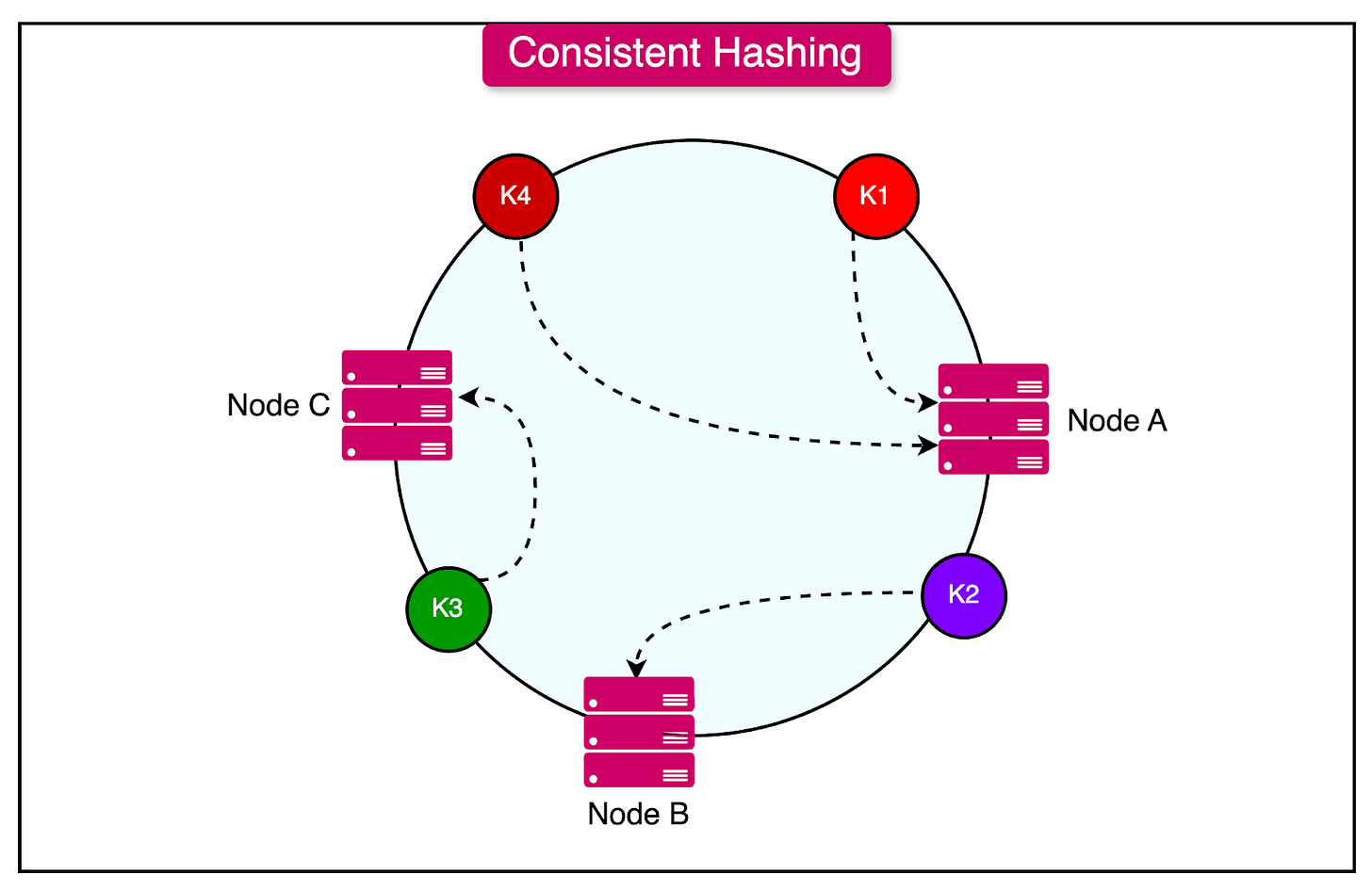 The diagram below shows the concept of consistent hashing to distribute keys across nodes.