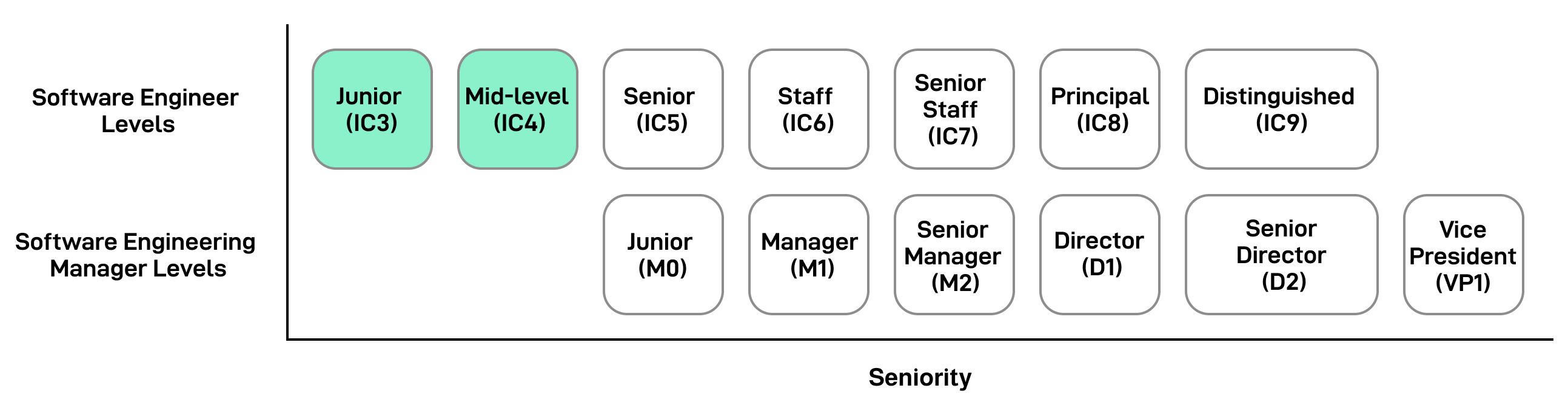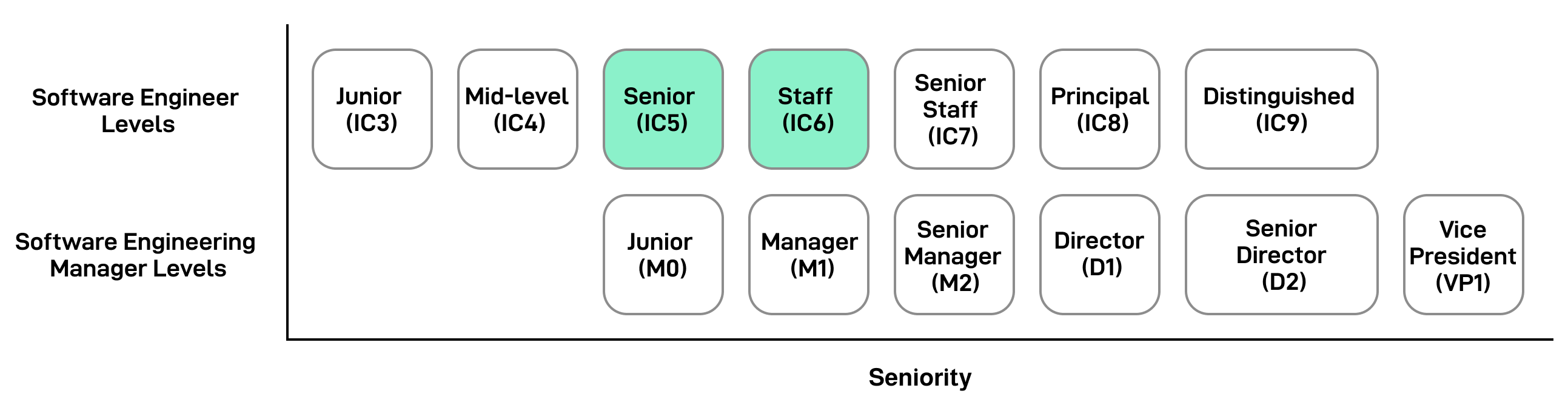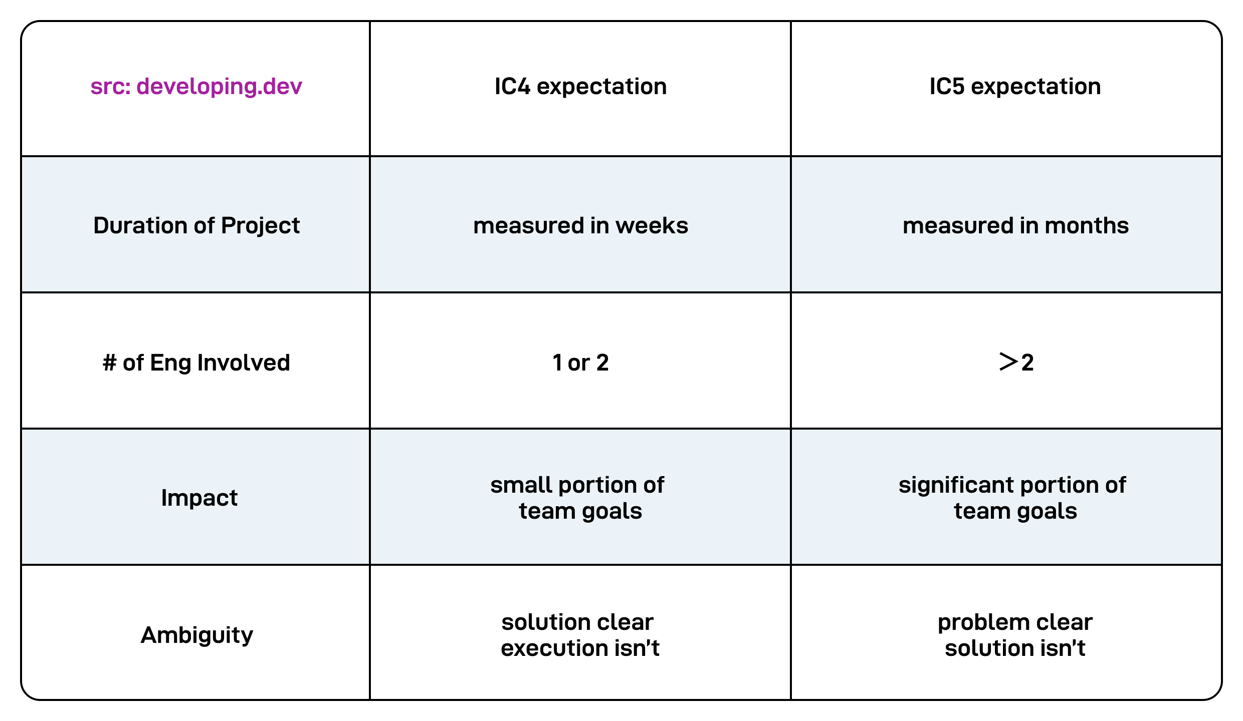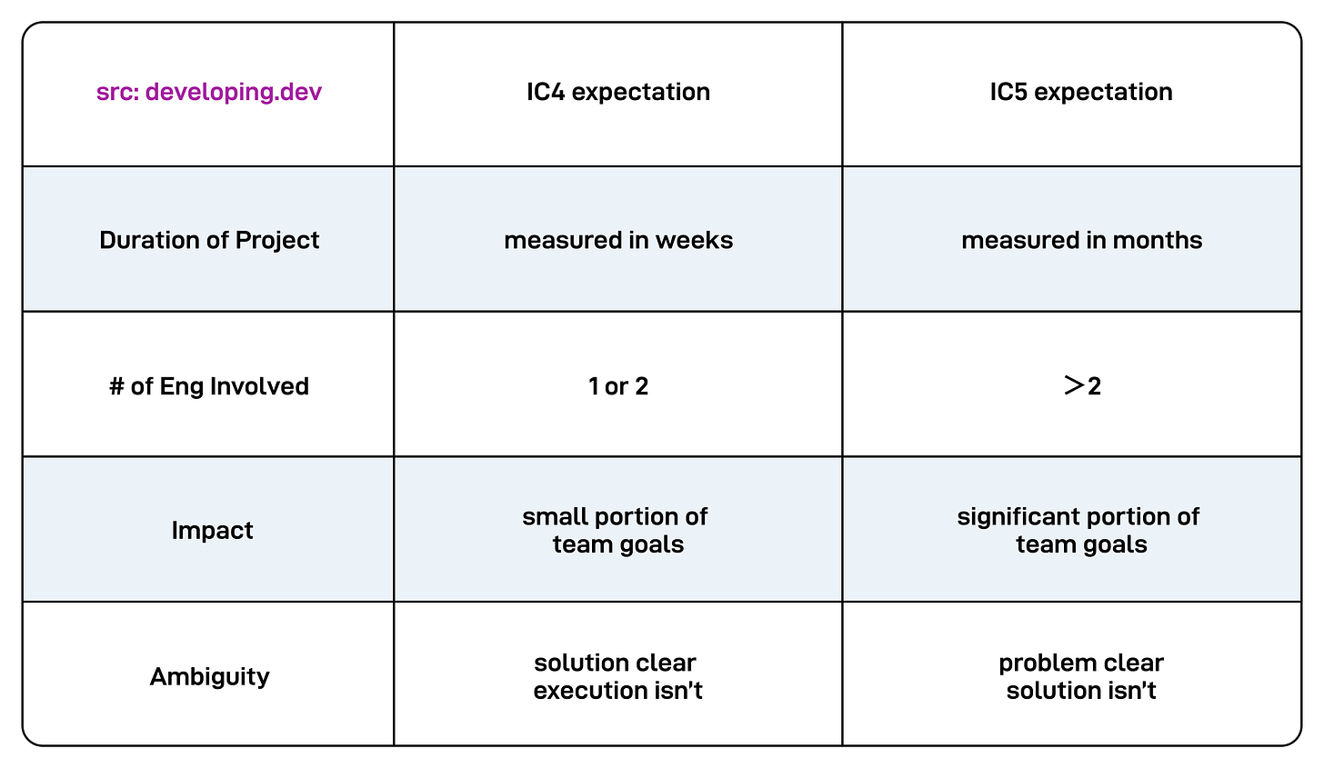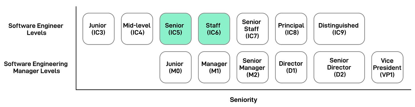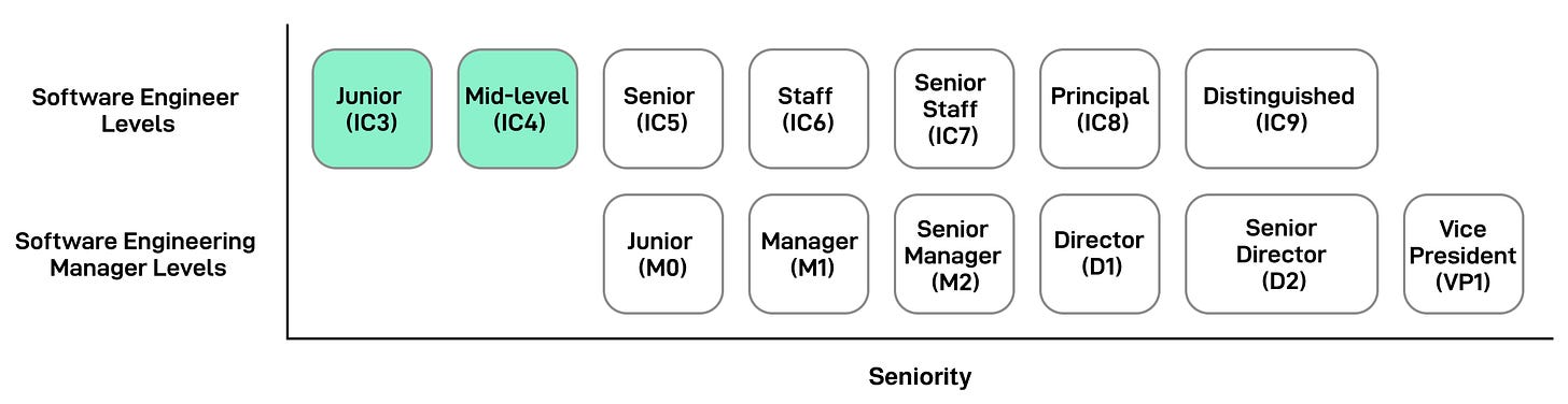 Also, many companies consider only senior engineers (IC5) and higher to be “terminal levels.” You must eventually get promoted to IC5, or you’ll be managed out. Most engineers are promoted in time, so it’s not meant to scare you but to encourage you to grow.