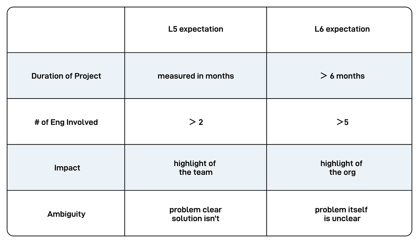 Staff Engineers (L6) handle more ambiguity. They don’t just solve known problems; they create scope by finding impactful opportunities and problems. Managers work with their L6s to expand the scope of the team.