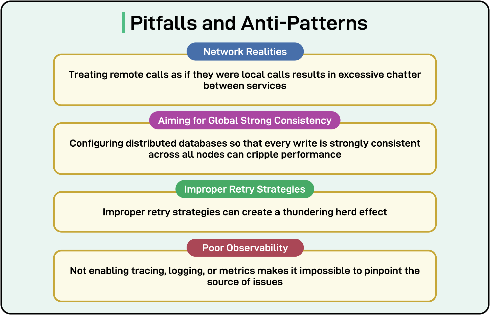 Common pitfalls and anti-patterns developers should avoid are ignoring network realities, aiming for a strong global consistency for all operations, and improper retry strategies.
