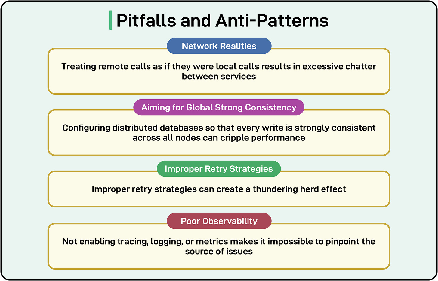 Ignoring Network Realities: Treating remote calls as if they were local, assuming near-zero latency and unlimited bandwidth. This often manifests as excessive chatter between microservices or large synchronous payloads that drag performance.