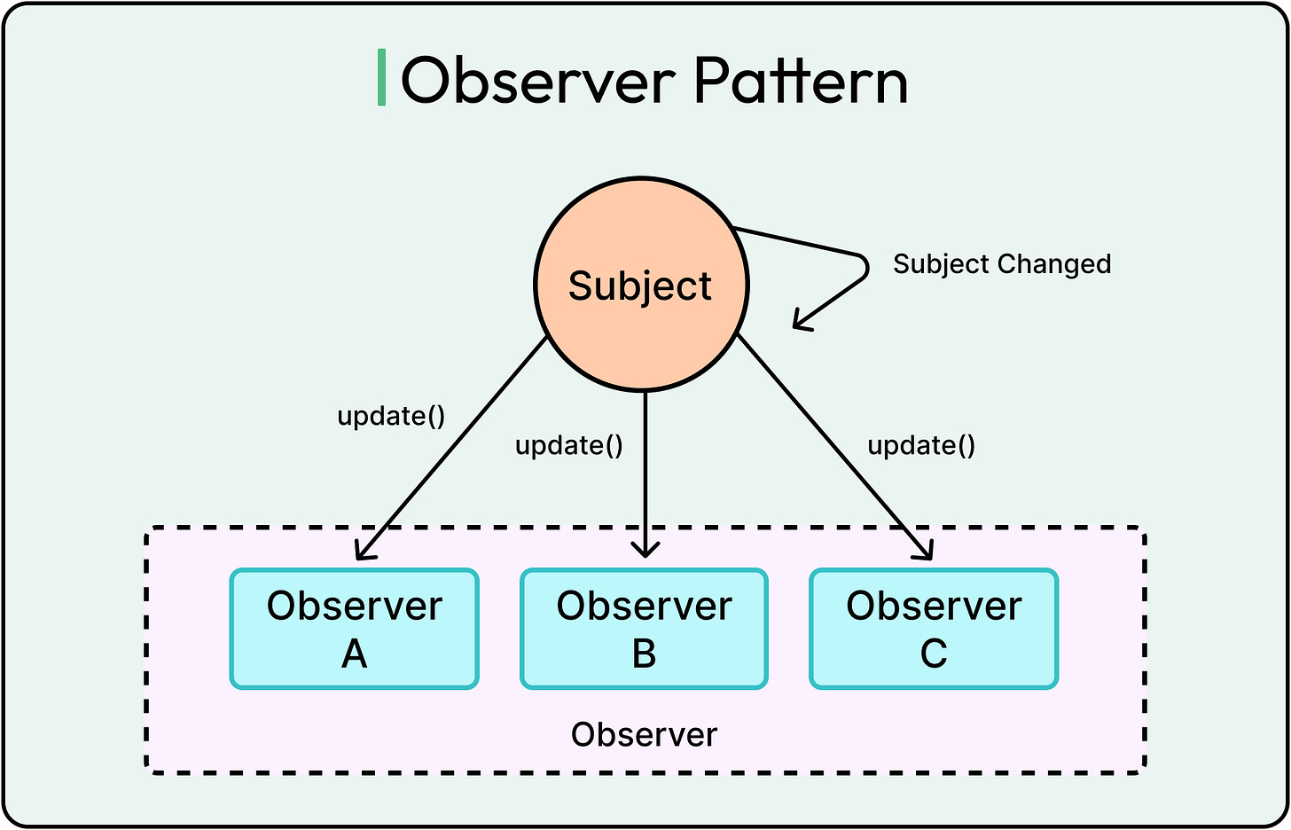 This pattern is often used when UI updates are triggered by model changes. Also, it is common in event-driven systems where multiple components react to a single change.
