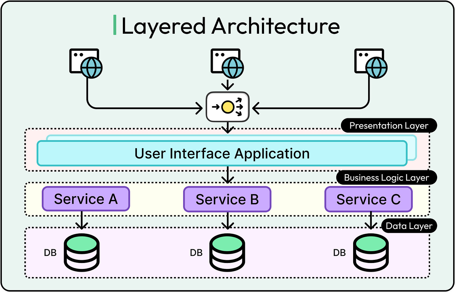 Layered or “n-tier” architecture (presentation, business logic, data access) has been the default pattern for decades. It structures code by technical responsibility, not business domain.