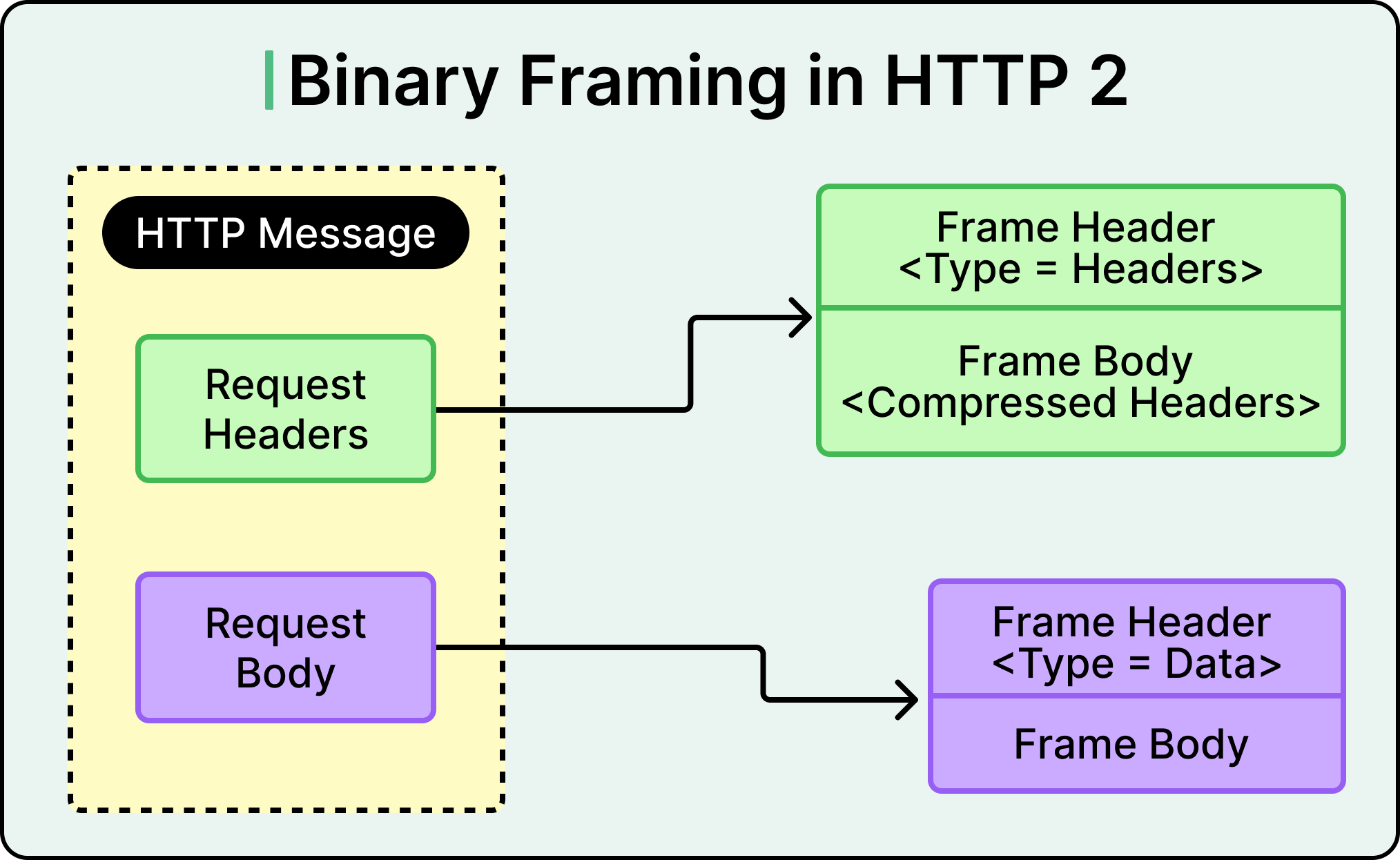 The most fundamental shift was HTTP/2 replacing the textual, line-by-line format of HTTP/1.x with a binary framing layer. Instead of parsing human-readable strings like Content-Type: application/json, HTTP/2 breaks all data into compact, structured binary frames. These frames are assigne independent streams, each with its ID.