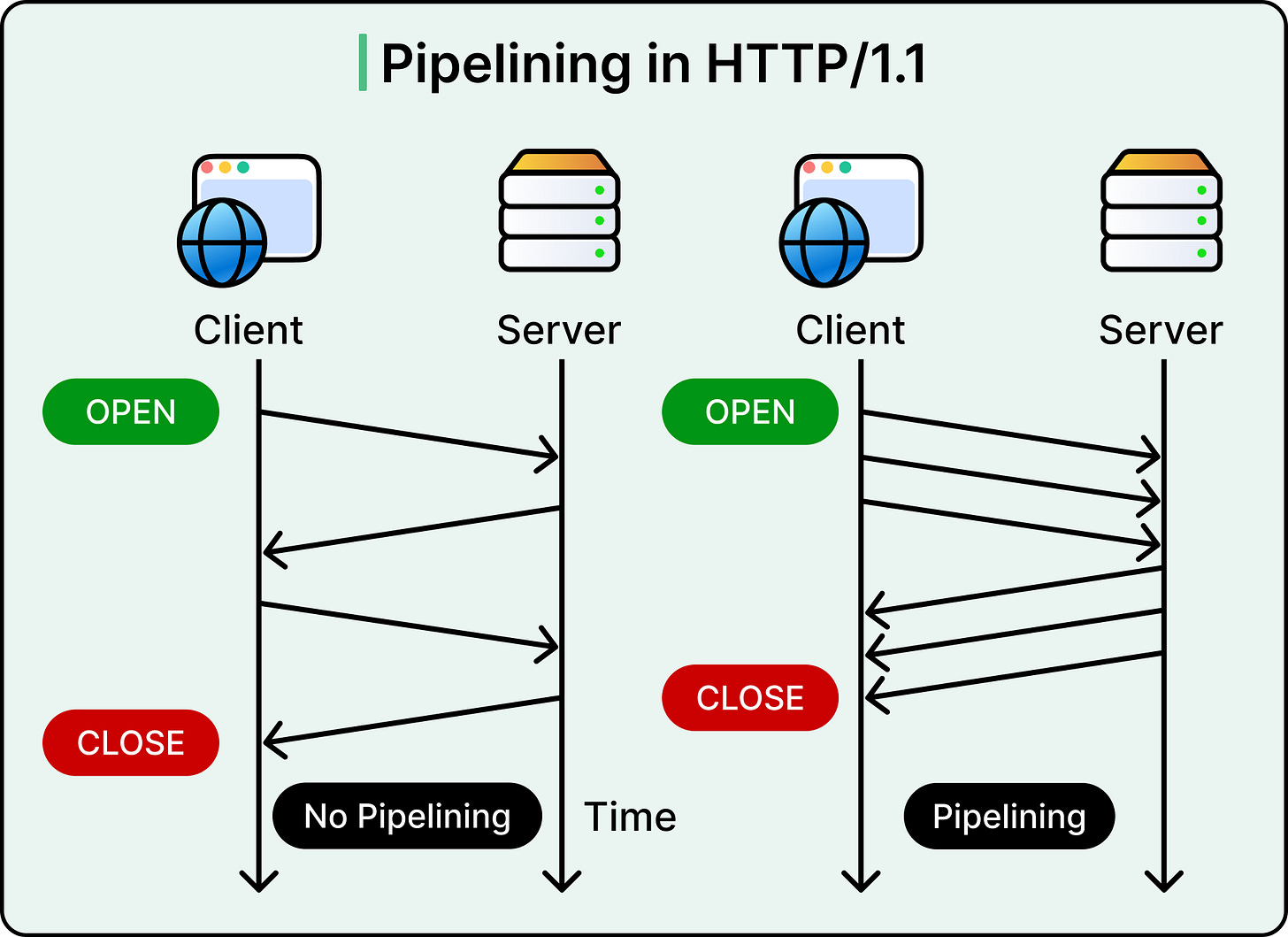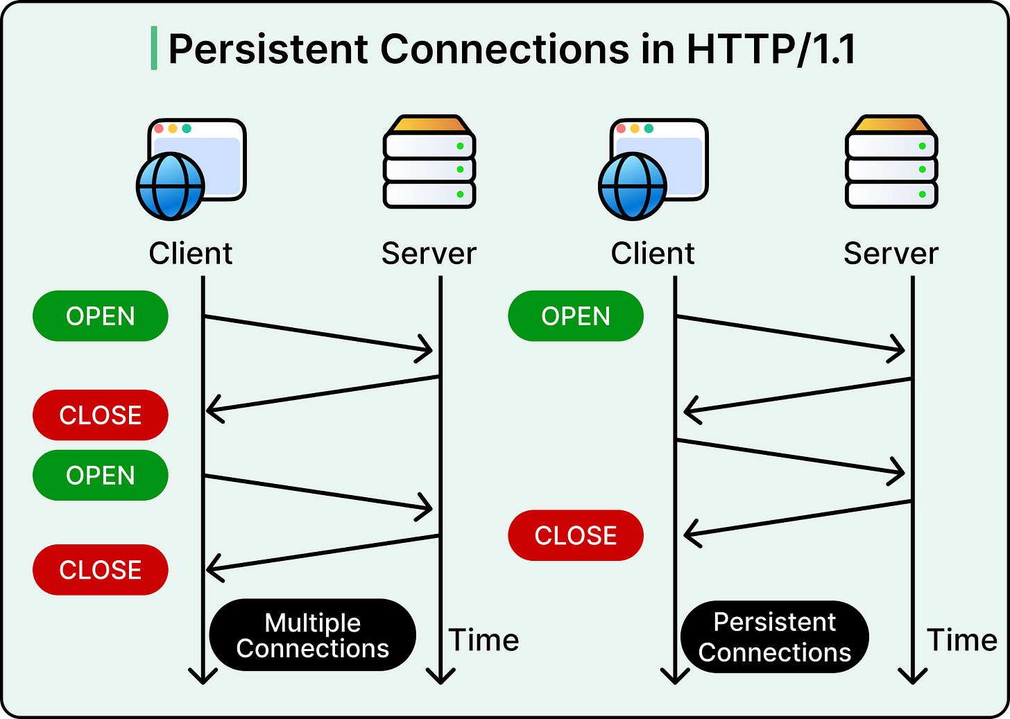 The most important shift in HTTP/1.1 was the support for persistent connections. In HTTP/1.0, every request opened a new TCP connection, which is a costly and slow operation. HTTP/1.1 introduced “Connection: keep-alive”, which allowed multiple requests and responses to travel over the same TCP connection without reopening the socket every time. This single feature dramatically reduced latency and network overhead for web pages that needed dozens of assets.