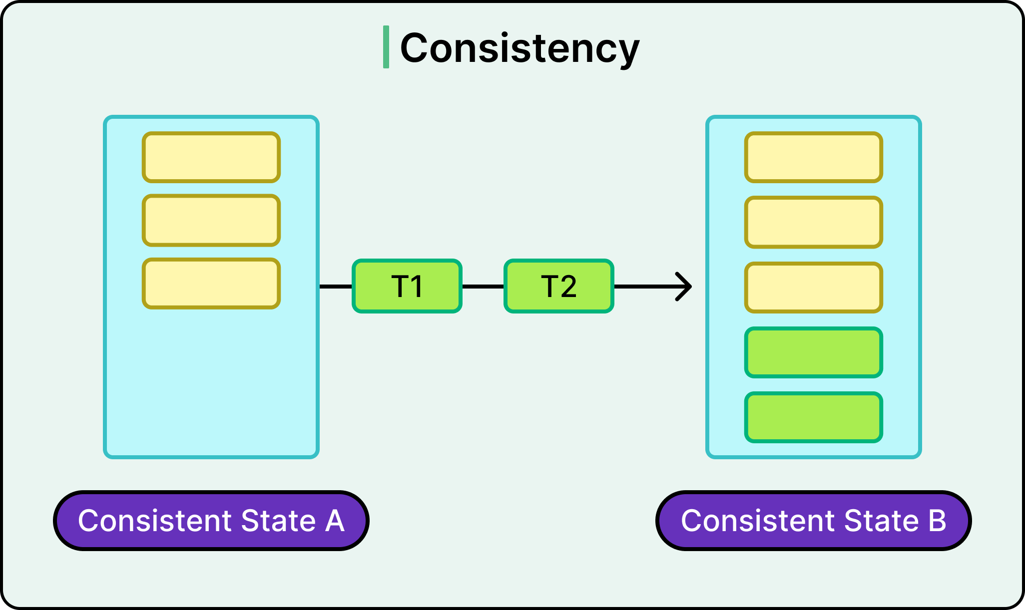Consistency ensures that a transaction moves the database from one valid state to another.