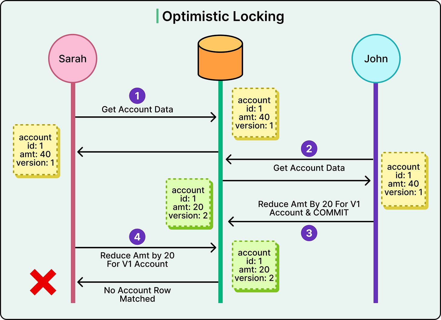 John attempts to reduce the balance by 20 and commit his change. At commit time, the database checks: is the row still at “version: 1”?