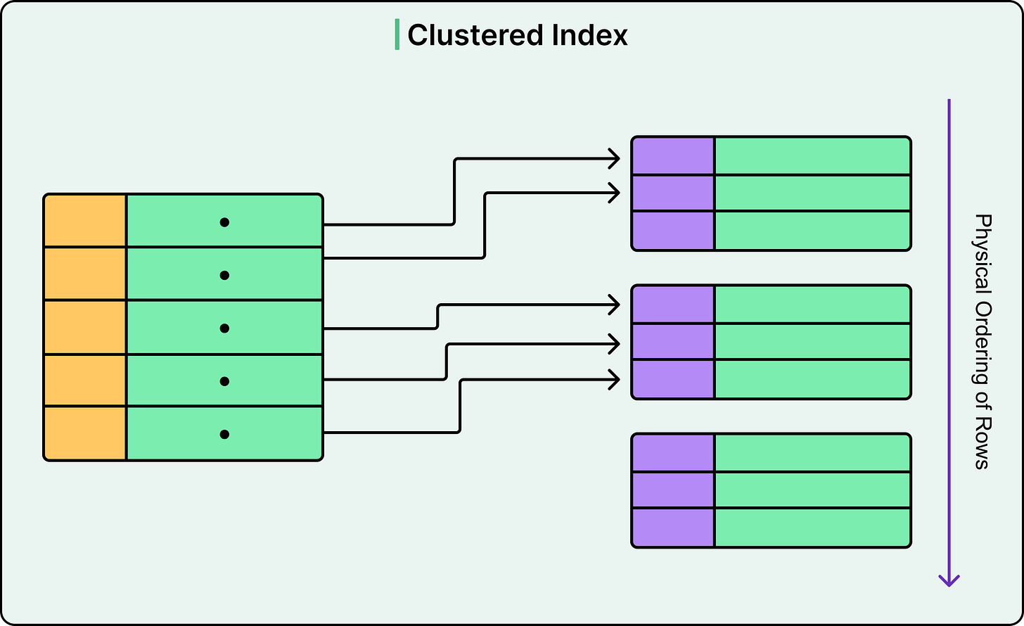 SELECT * FROM orders WHERE order_id BETWEEN 1000 AND 1100;This performs well because the rows are stored sequentially. Some engines, like SQL Server, allow developers to define which index is clustered explicitly, even if it's not the primary key.