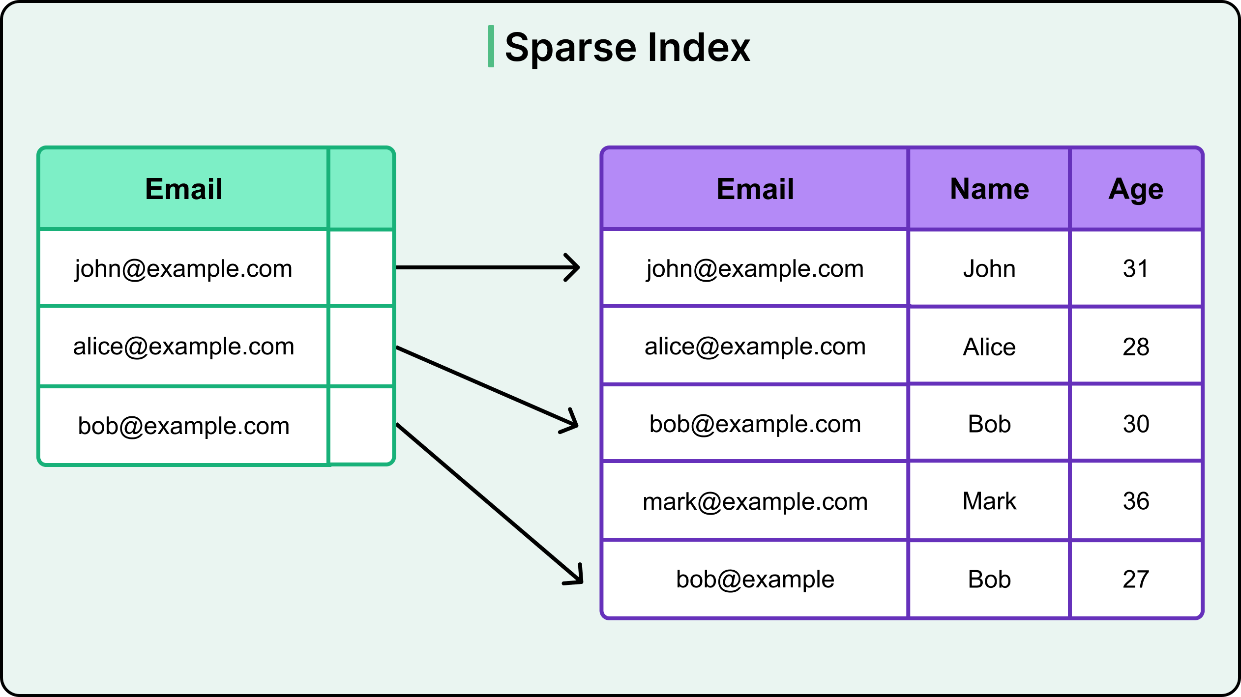 CREATE INDEX idx_email ON users(email);Every email address in the table appears in the index. Now, consider the following query searching for a specific email: