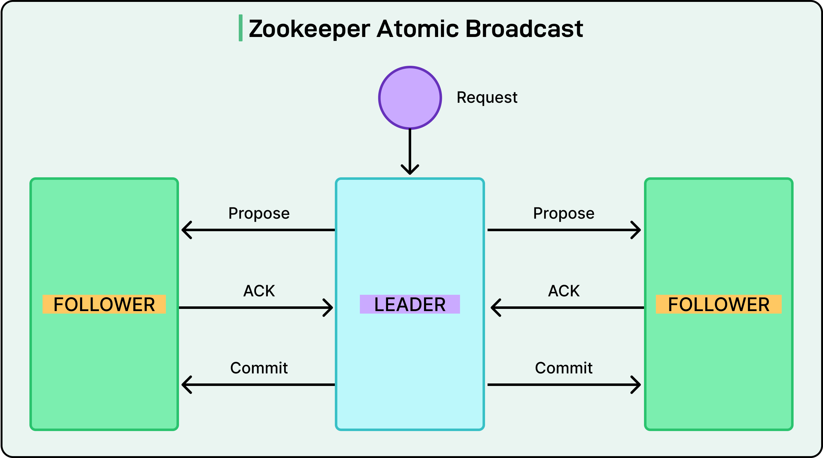 Internally, ZooKeeper uses its protocol called Zab (ZooKeeper Atomic Broadcast). Zab handles both leader election and state replication, ensuring that even coordination metadata is safe, consistent, and fault-tolerant.