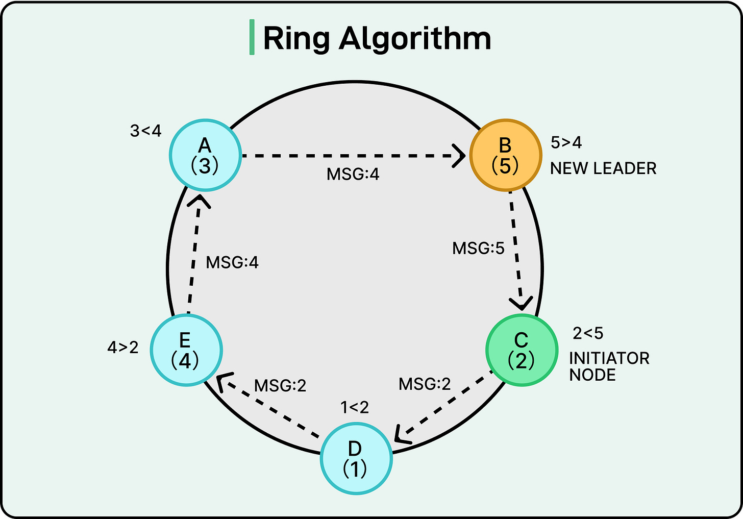 The Ring algorithm approaches leader election with one simple rule: pass a message around the circle, and the node with the highest ID wins. Unlike the Bully algorithm, there’s no concept of interruption or priority escalation. Every node gets a chance to participate, but only one is crowned as the leader.