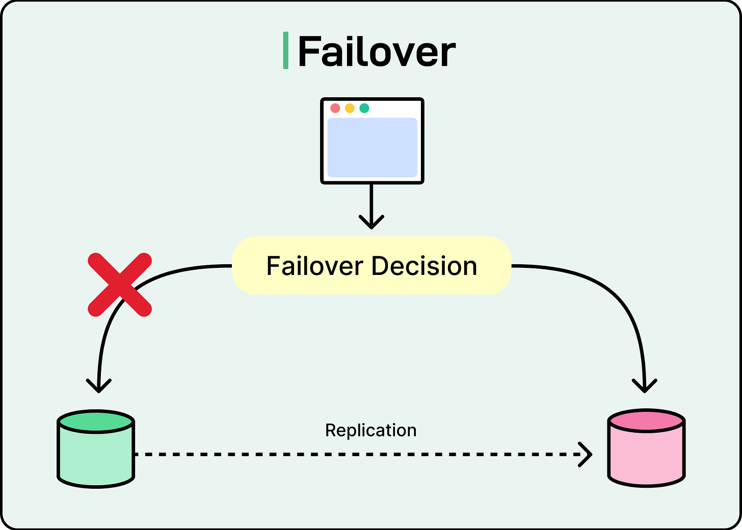 Failover is the mechanism that ensures the system keeps operating despite disruptions. It detects when something breaks, then automatically redirects traffic or promotes backups, so the system can recover without human intervention.