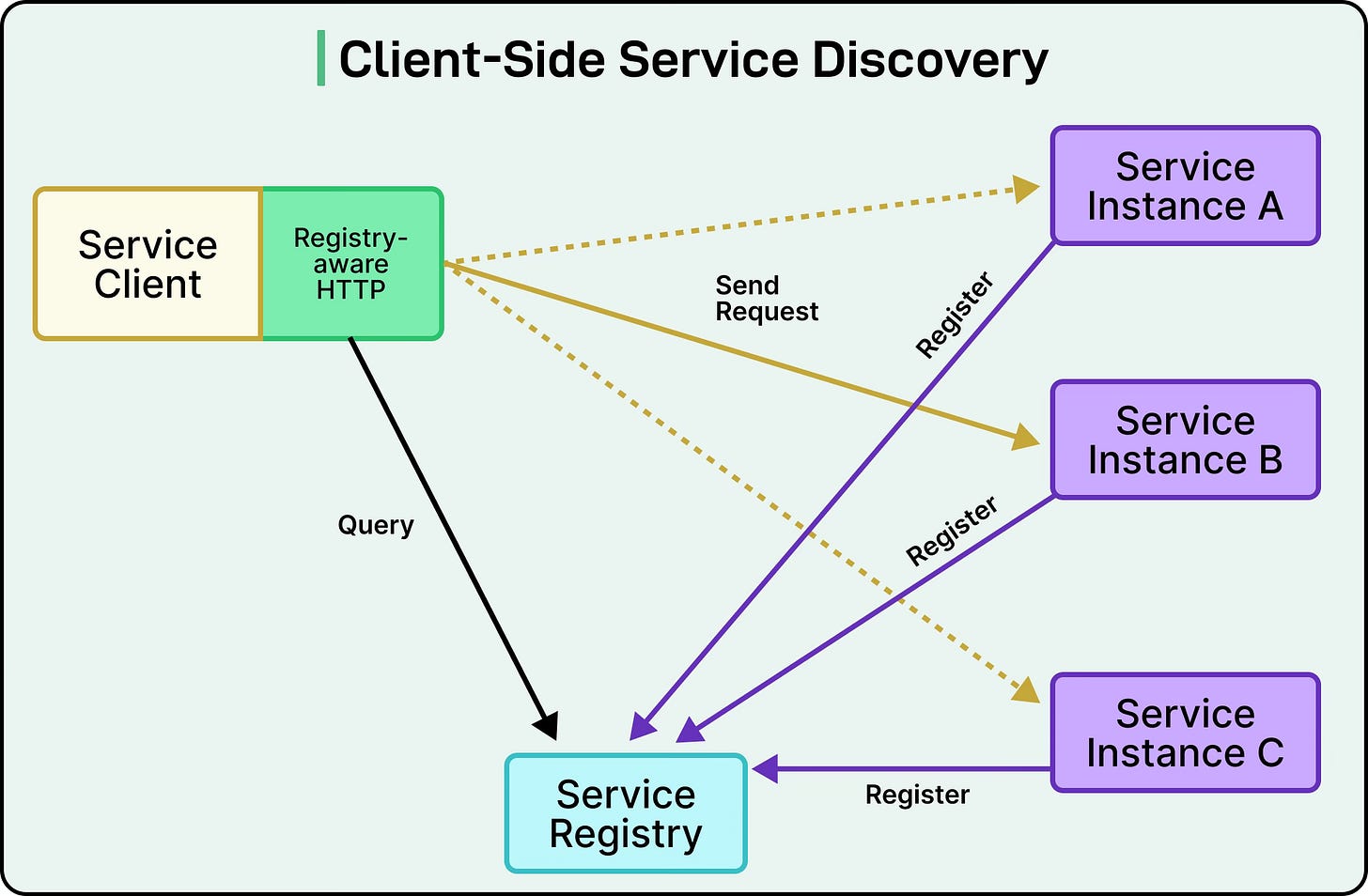 When the Order Service needs to process a payment, it directly queries the service registry for all available Payment Service instances.