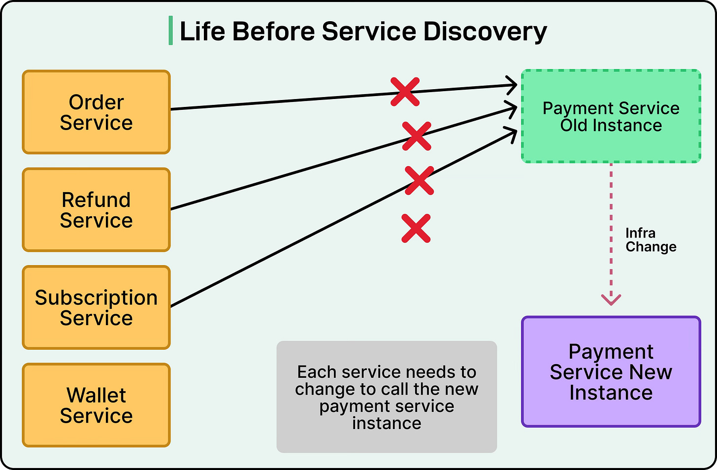 The Refund Service, Subscription Service, and Wallet Service all have the same hardcoded address. Each one needs its configuration updated and restarted, causing widespread disruption.