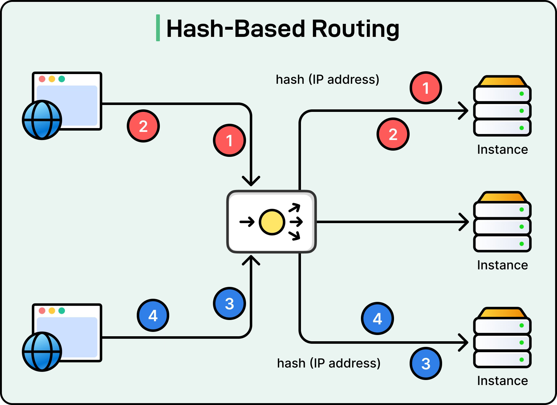 Hash-based routing uses a hashing function to map a client or request attribute to a specific server.