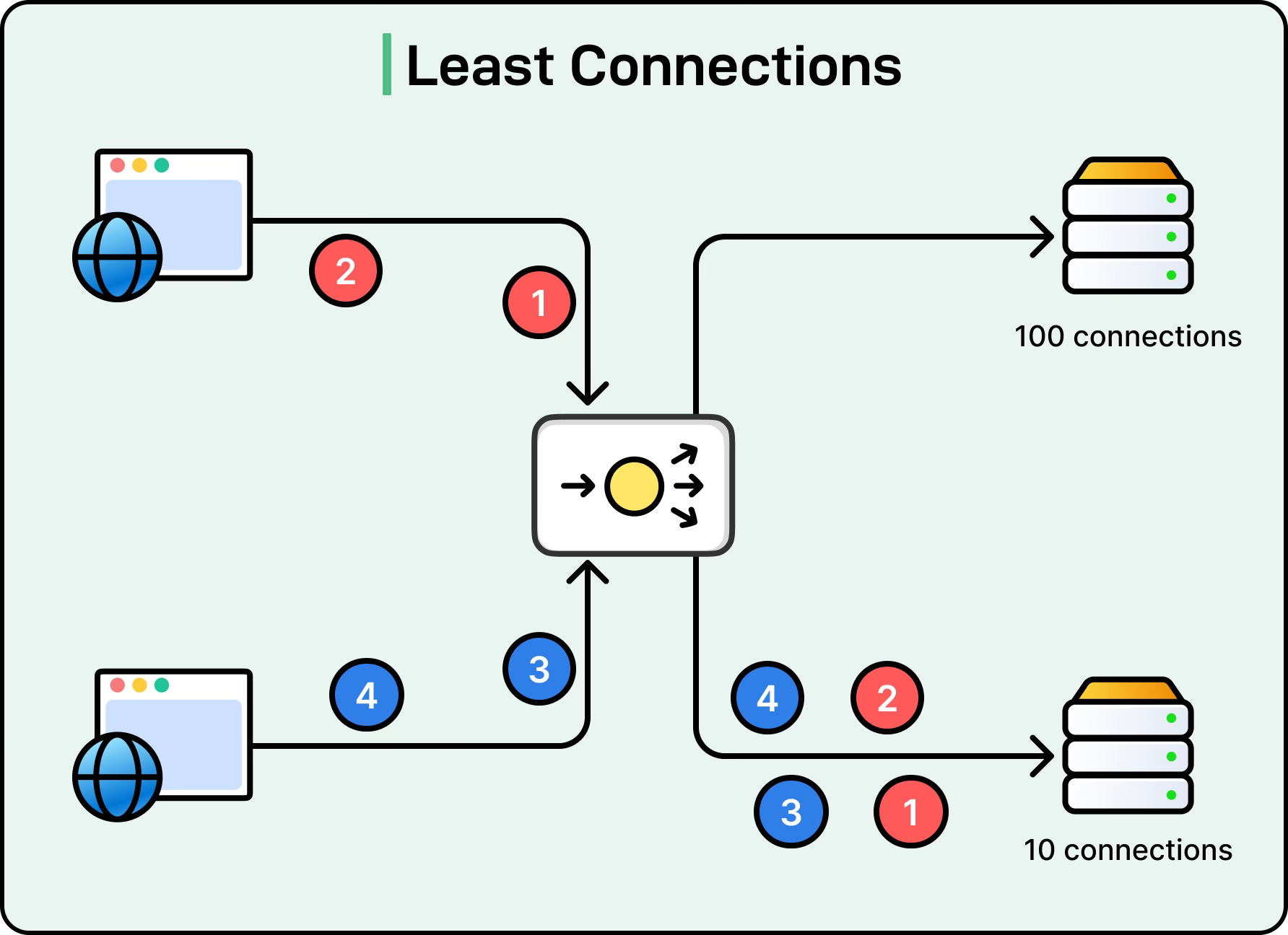 For instance, if Server A currently has 100 active connections, and Server B has 10, the next request will go to Server B. This algorithm is particularly useful for long-lived connections such as database queries or streaming applications, where connection counts can vary widely between servers.