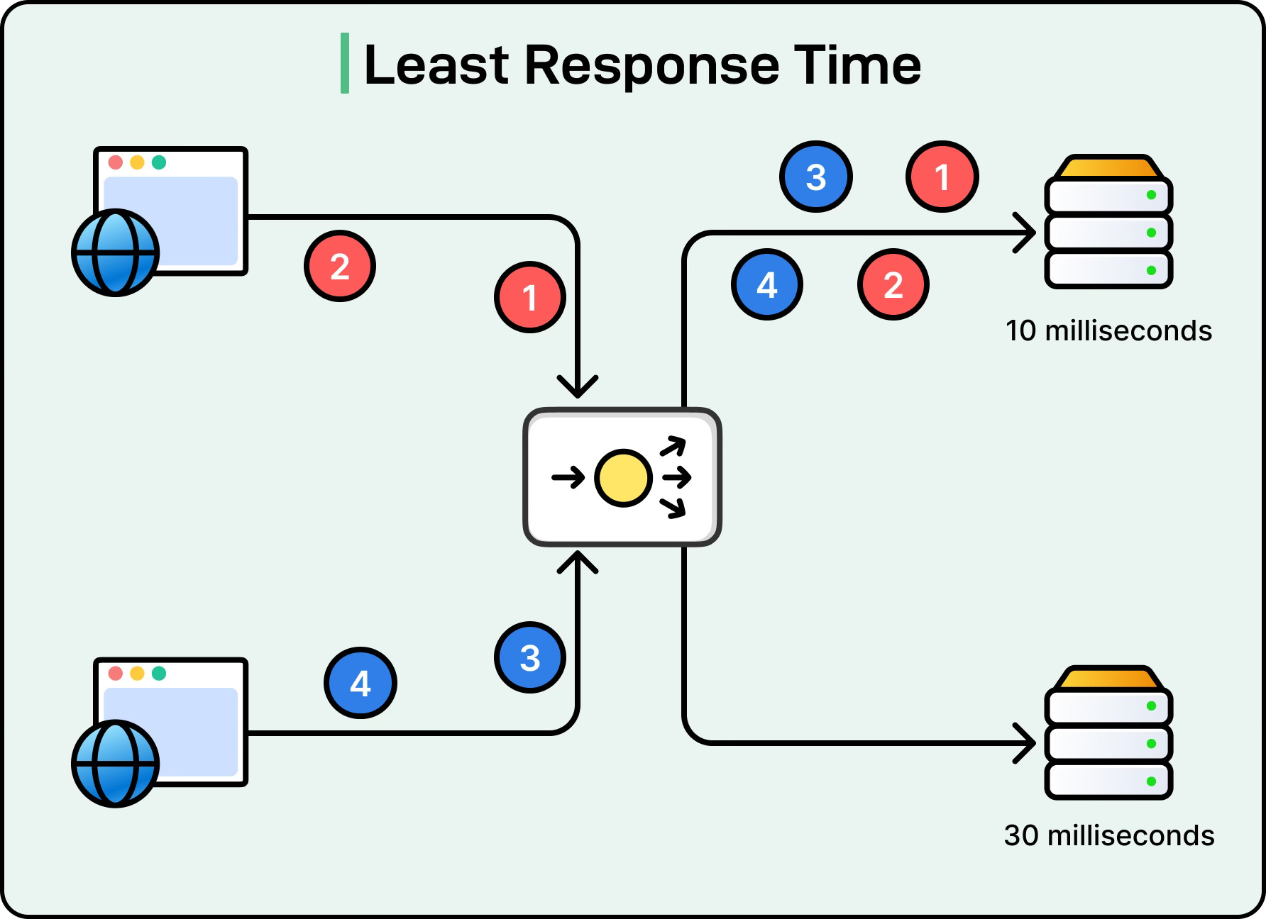 This is especially useful for web applications or APIs where responsiveness is critical. If Server A has low latency but more connections and Server B has high latency but fewer connections, the load balancer will favor Server A as long as its response times remain better. The challenge here is that measuring response times requires constant monitoring and metrics collection, which introduces some overhead.