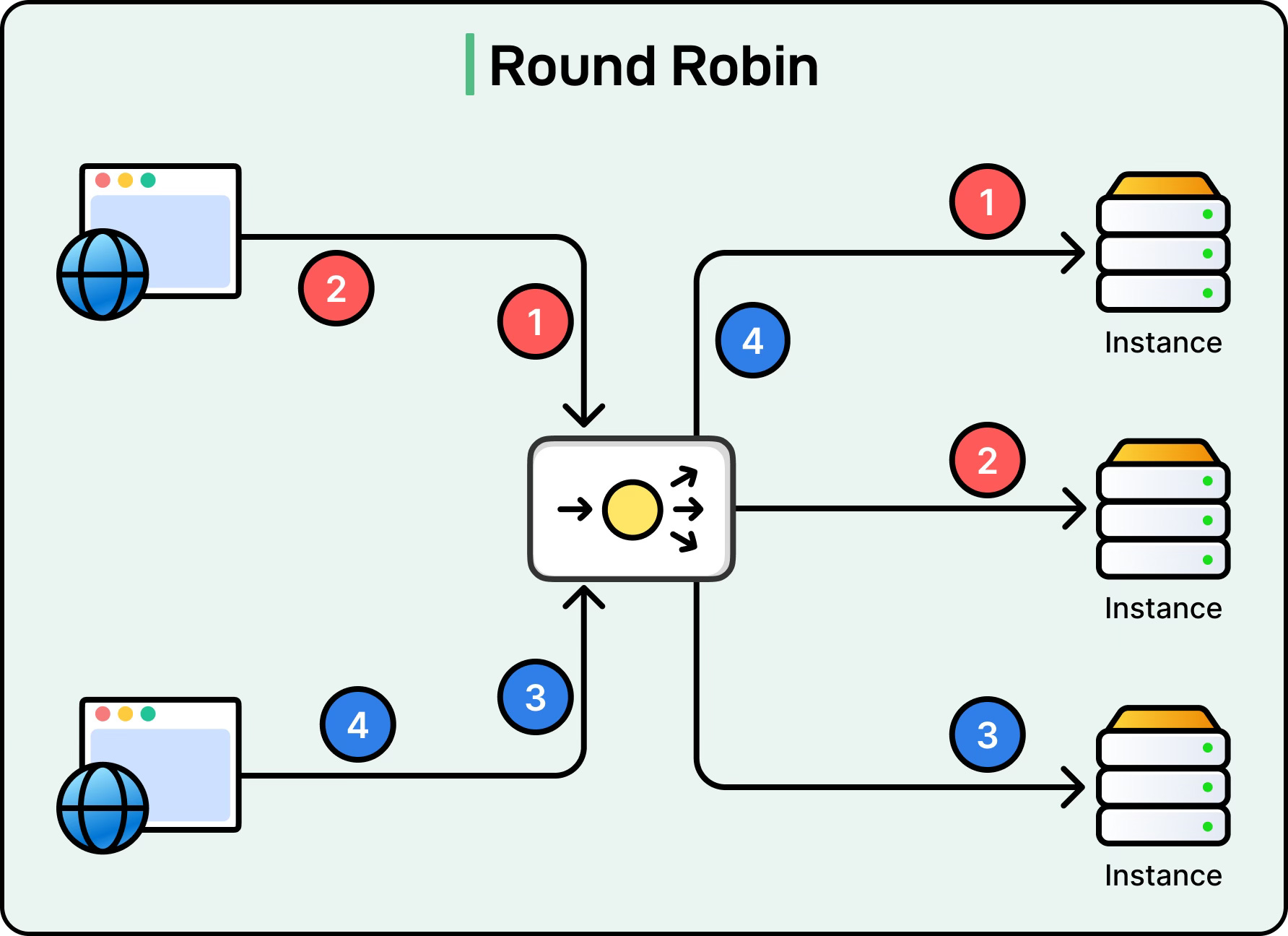 For example, if there are three server instances (A, B, C), the requests will be distributed as A followed by B followed by C, and then back to A, and so on. This approach works well when all servers have roughly the same capacity and the requests are similar in size.